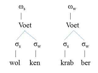 trocheïsche voeten (V), en de voeten in prosodische woorden (ω).