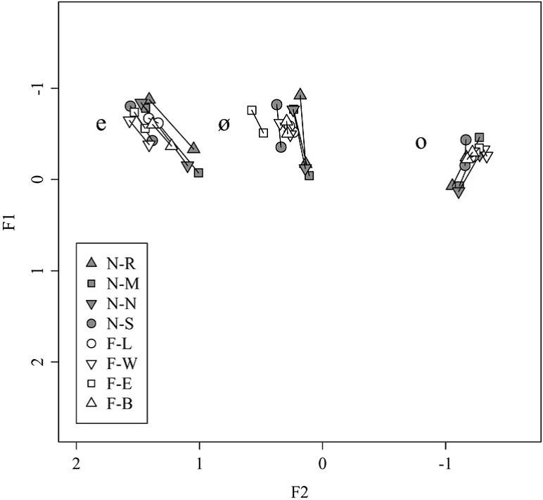 van de eerste en tweede formant (F1 en F2) van het begin en einde van de
